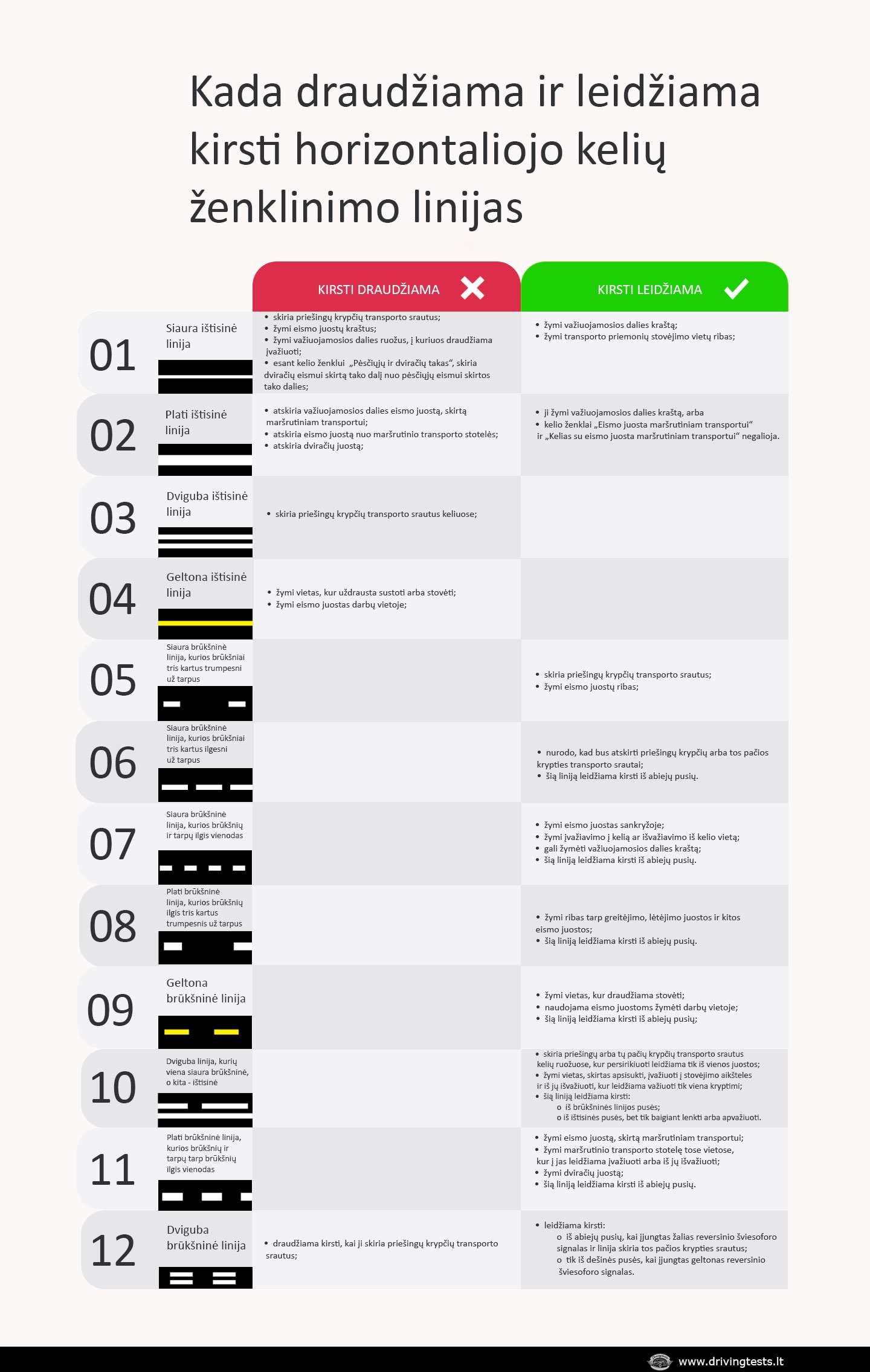 Ši lentelė padės geriau suprasti, kada pagal KET leidžiama arba draudžiama kirsti skirtingas horizontalaus kelio ženklinimo linijas.