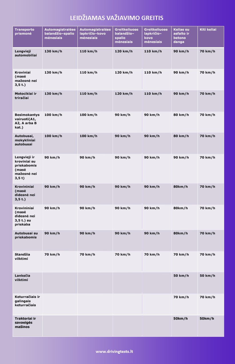 Ši lentelė nurodo maksimalų greitį, kuriuo pagal KET leidžiama važiuoti skirtingų rūšių transporto priemonėms